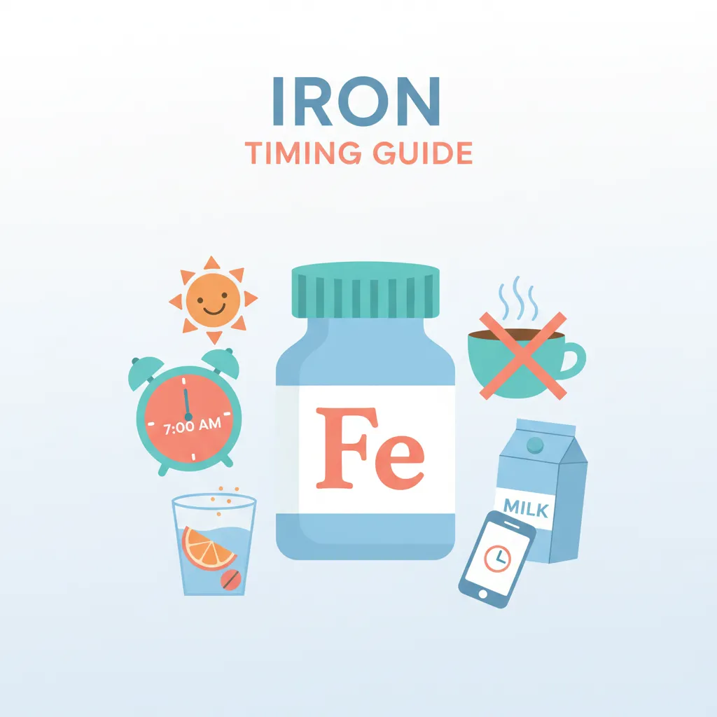 Take iron on an empty stomach, ideally 1 hour before or 2 hours after a meal, with a glass of water or orange juice. Vitamin C boosts iron absorption significantly. Calcium, coffee, tea, and dairy all block it. Timing matters more for iron than for almost any other supplement, so getting this right can be the difference between a supplement that works and one that barely registers.